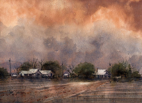 “Storytelling through the medium of watercolor in West Texas has afforded me the precious privilege of recording the awesomeness of the sky and the point at which it merges with the land. When I further explore the imprint that humankind has left at this intersection in the form of his dwellings and structures, I have begun to revive memories, evoke emotions and, if successful, tell a story.”
